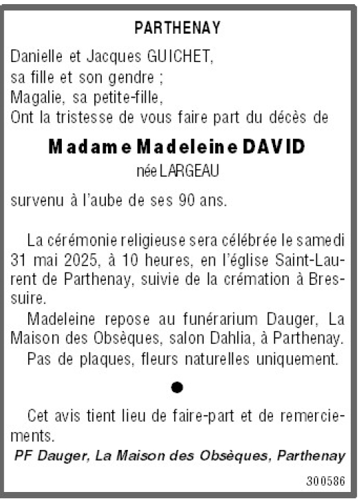 Cet espace « condoléances » est dédié à la mémoire de Madame Madeleine DAVID née LARGEAU.