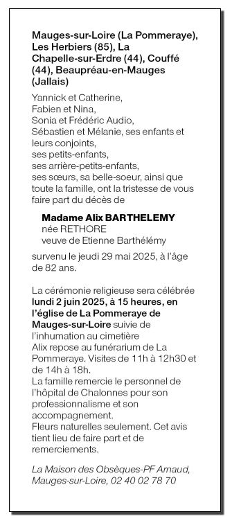 de Madame Alix BARTHÉLÉMY née RÉTHORÉ