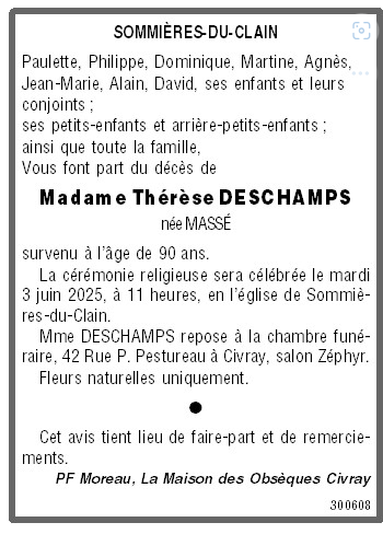 Cet espace « condoléances » est dédié à la mémoire de Madame Thérèse DESCHAMPS née MASSÉ.