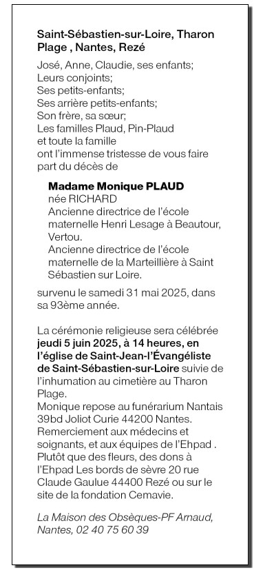 Cet espace « condoléances » est dédié à la mémoire de Madame Monique PLAUD née RICHARD.
