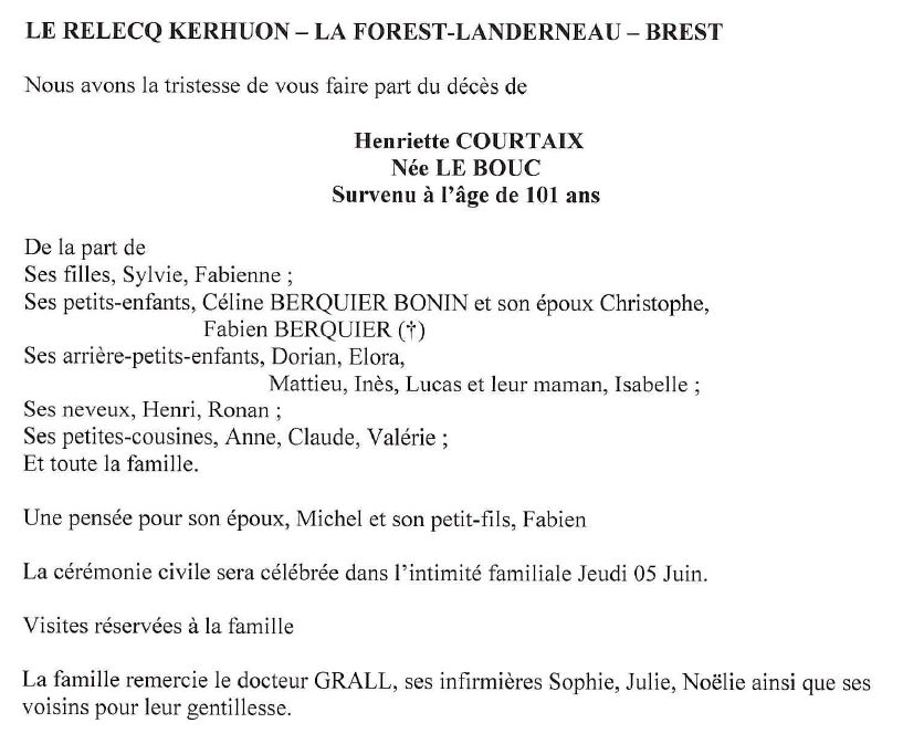 Cet espace « condoléances » est dédié à la mémoire de Madame Henriette COURTAIX née LE BOUC.