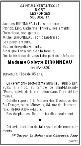 de Madame Colette BIRONNEAU née SAN-JOSÉ
