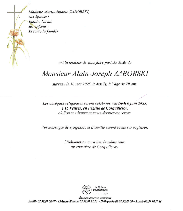 Cet espace « condoléances » est dédié à la mémoire de Monsieur Alain-Joseph ZABORSKI.