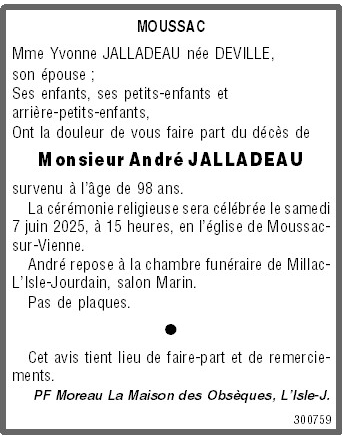 Cet espace « condoléances » est dédié à la mémoire de Monsieur André JALLADEAU.