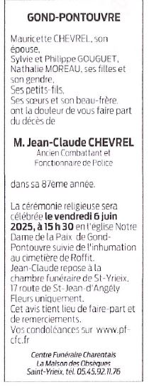 Cet espace « condoléances » est dédié à la mémoire de Monsieur Jean-Claude CHEVREL.