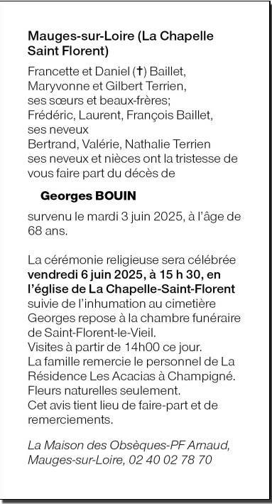 Cet espace « condoléances » est dédié à la mémoire de Monsieur Georges BOUIN.