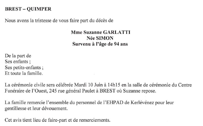Cet espace « condoléances » est dédié à la mémoire de Madame Suzanne GARLATTI née SIMON.