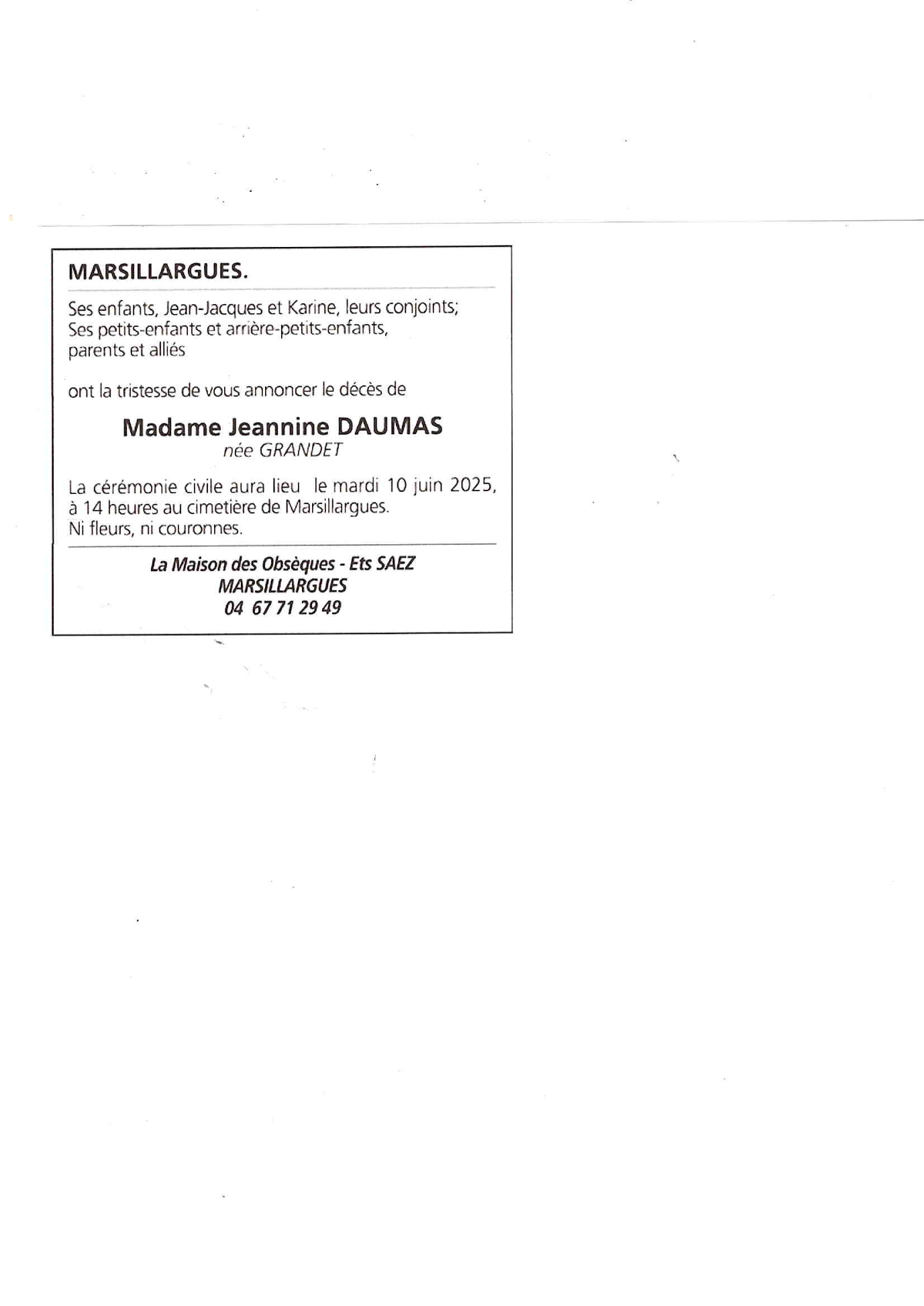 Cet espace « condoléances » est dédié à la mémoire de Madame Jeannine DAUMAS née GRANDET.