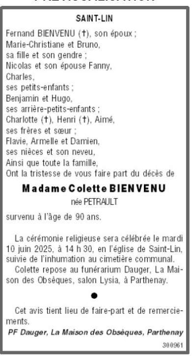 de Madame Colette BIENVENU née PETRAULT