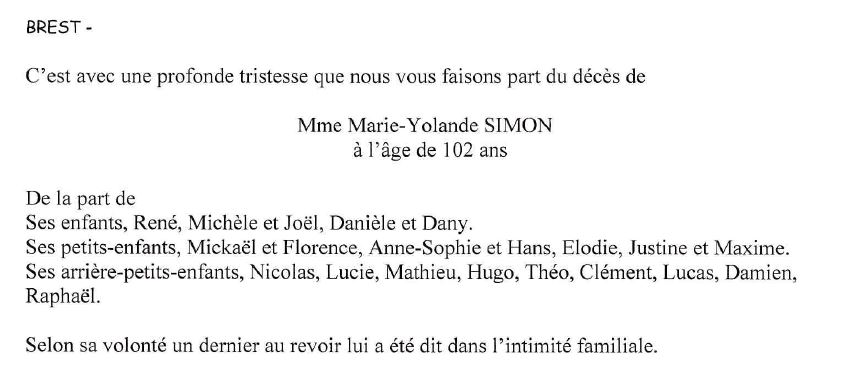 Cet espace « condoléances » est dédié à la mémoire de Madame Marie Yolande SIMON née LE GUEN.