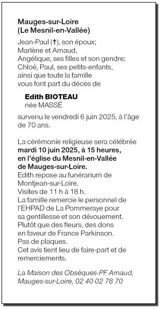 de Madame Edith BIOTEAU née MASSÉ