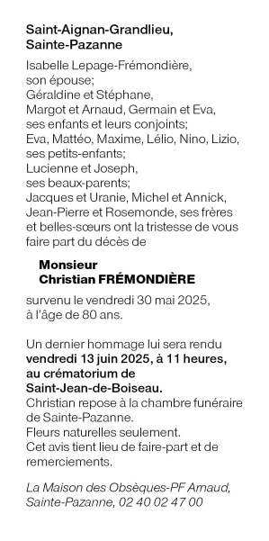 Cet espace « condoléances » est dédié à la mémoire de Monsieur Christian FRÉMONDIÈRE.