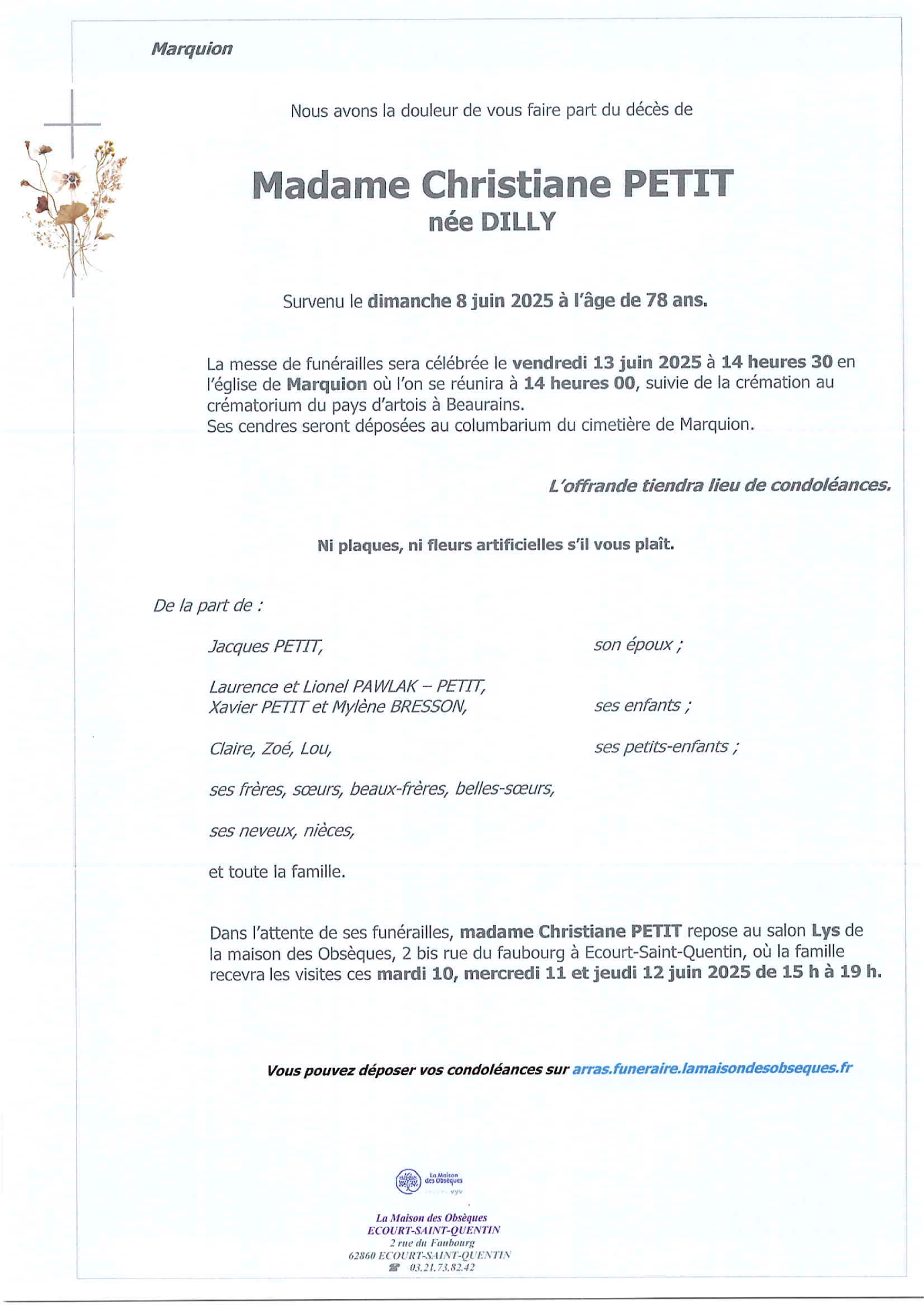 N’hésitez pas à renseigner cette page à vos connaissances. Ceux qui sont loin ou qui n’ont pas la possibilité de se joindre à la cérémonie trouveront ici une façon simple de montrer leurs sentiments à la famille dans ce moment difficile.