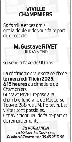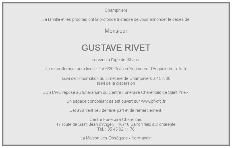 Cet espace « condoléances » est dédié à la mémoire de Monsieur GUSTAVE RIVET.