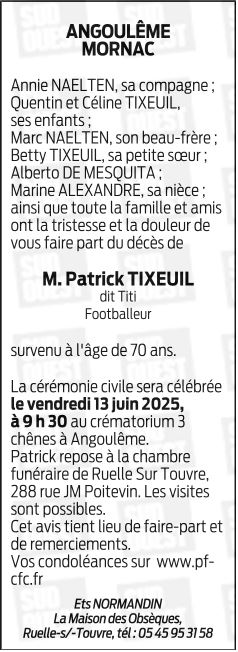 Cet espace « condoléances » est dédié à la mémoire de Monsieur PATRICK TIXEUIL.