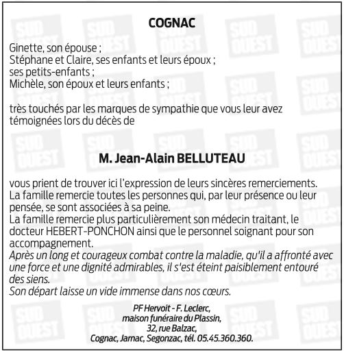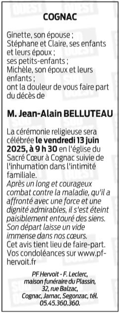 Cet espace « condoléances » est dédié à la mémoire de Monsieur Jean-Alain BELLUTEAU.