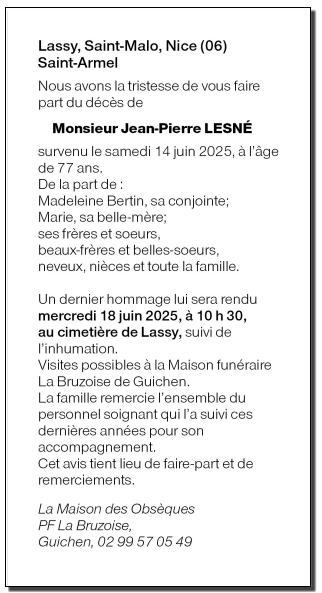 Décédé à Rennes (35000) le samedi 14 juin 2025