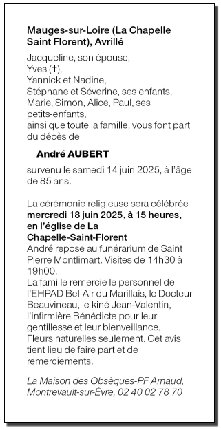 Décédé à Le Marillais (49410) le samedi 14 juin 2025