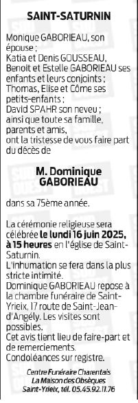 Cet espace « condoléances » est dédié à la mémoire de Monsieur DOMINIQUE GABORIEAU.
