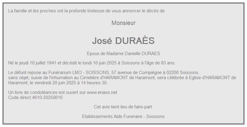 Cet espace « condoléances » est dédié à la mémoire de Monsieur José DURAÈS.