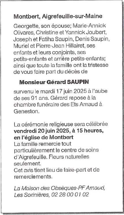 Décédé à Montbert (44140) le mardi 17 juin 2025