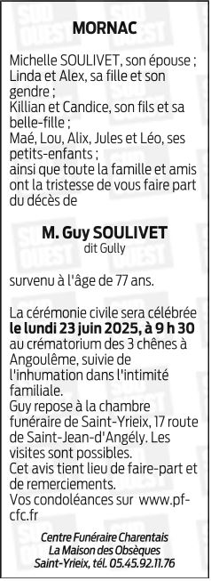 Cet espace « condoléances » est dédié à la mémoire de Monsieur GUY SOULIVET.