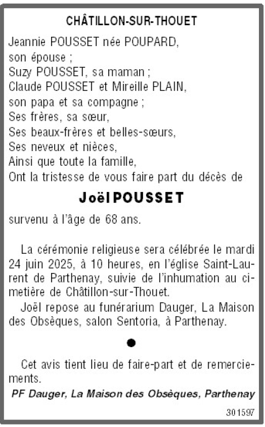 Cet espace « condoléances » est dédié à la mémoire de Monsieur Joël POUSSET.