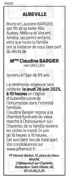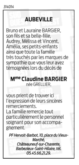 Cet espace « condoléances » est dédié à la mémoire de Madame Claudine BARGIER née GRELLIER.