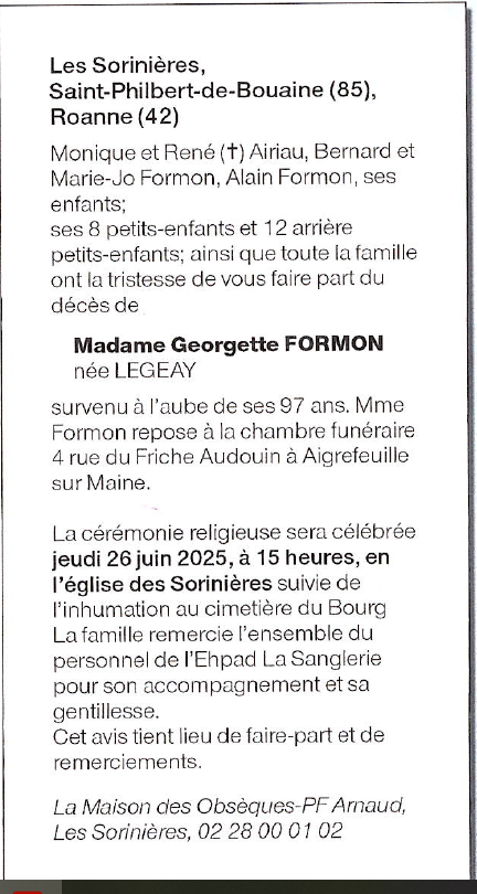 Cet espace « condoléances » est dédié à la mémoire de Madame Georgette FORMON (LEGEAY).