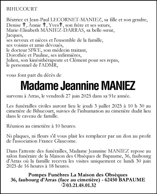 Cet espace « condoléances » est dédié à la mémoire de Madame Jeannine MANIEZ.