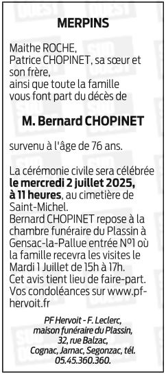 Cet espace « condoléances » est dédié à la mémoire de Monsieur Bernard CHOPINET.
