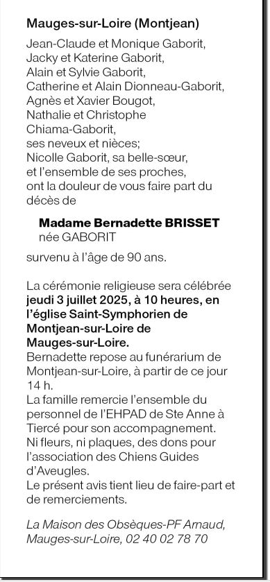 Cet espace « condoléances » est dédié à la mémoire de Madame Bernadette Brisset née GABORIT.