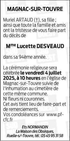 Cet espace « condoléances » est dédié à la mémoire de Madame Lucette DESVEAUD.