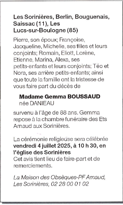Cet espace « condoléances » est dédié à la mémoire de Madame Gemma BOUSSAUD née DANIEAU.