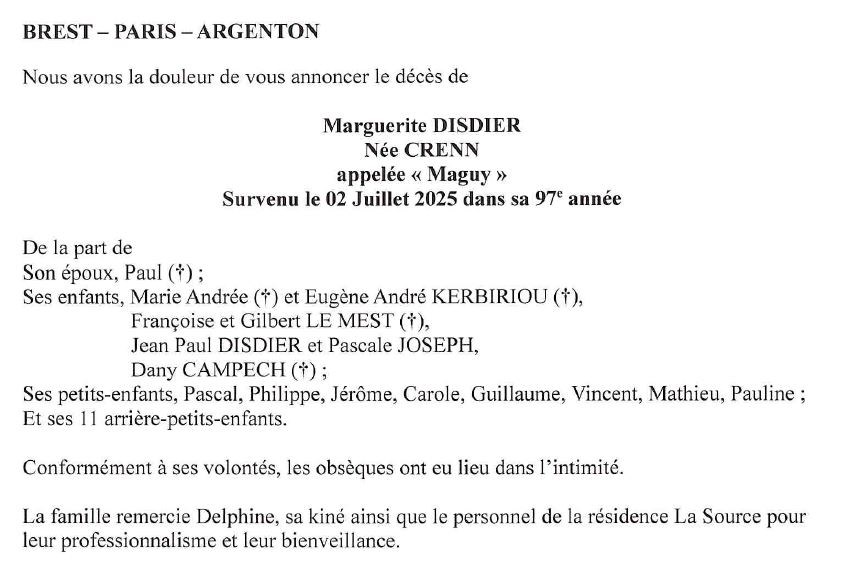 Cet espace « condoléances » est dédié à la mémoire de Madame Marguerite DISDIER née CRENN.