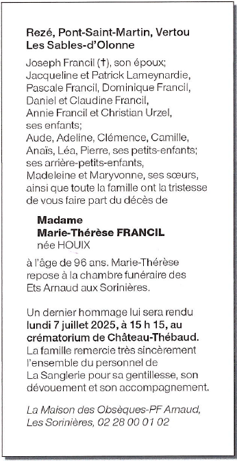de Madame Marie-Thérèse FRANCIL née HOUIX