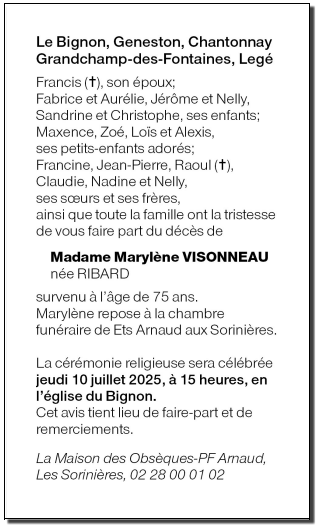 Cet espace « condoléances » est dédié à la mémoire de Madame Marylène VISONNEAU née RIBARD.