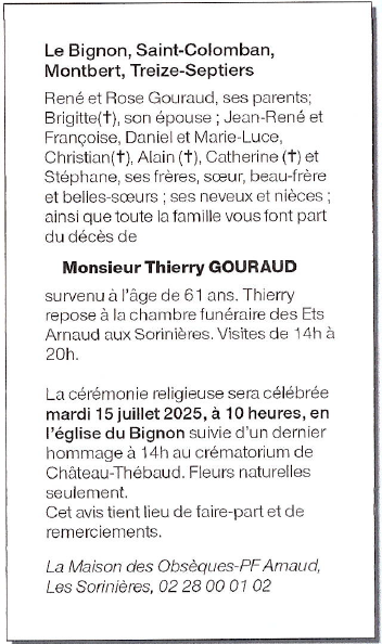 Cet espace « condoléances » est dédié à la mémoire de Monsieur Thierry GOURAUD.
