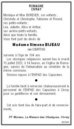 Cet espace « condoléances » est dédié à la mémoire de Madame Simone BIJEAU née COURTOIS.