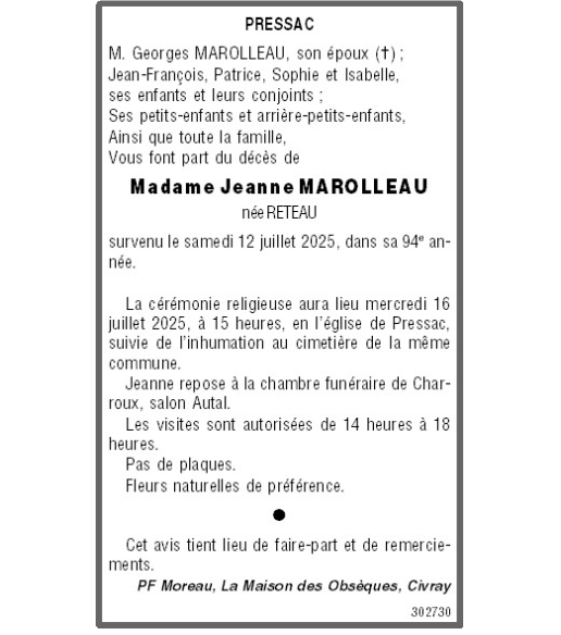 Cet espace « condoléances » est dédié à la mémoire de Madame Jeanne MAROLLEAU née RETEAU.