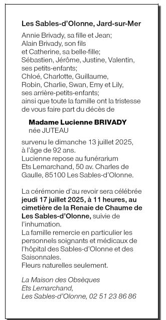 Cet espace « condoléances » est dédié à la mémoire de Madame Lucienne BRIVADY née JUTEAU.