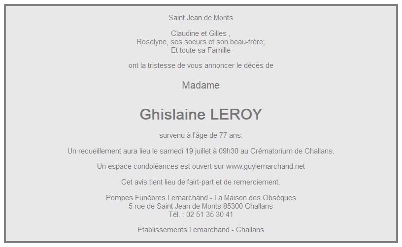 Cet espace « condoléances » est dédié à la mémoire de Madame Ghislaine LEROY.