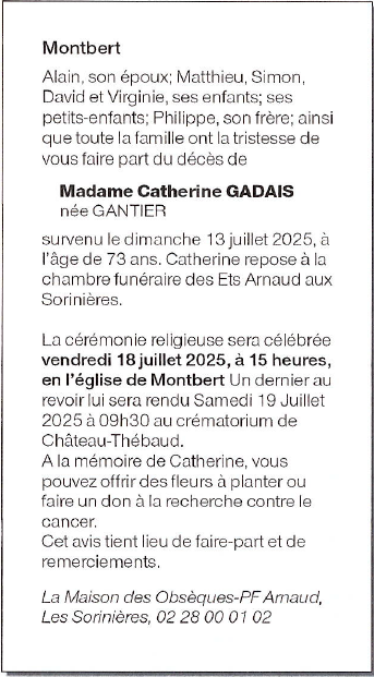 Cet espace « condoléances » est dédié à la mémoire de Madame Catherine GADAIS née GANTIER.