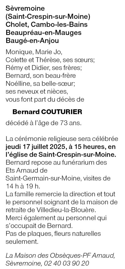 Cet espace « condoléances » est dédié à la mémoire de Monsieur Bernard COUTURIER.