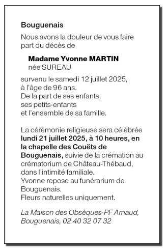 Cet espace « condoléances » est dédié à la mémoire de Madame Yvonne MARTIN née SUREAU.