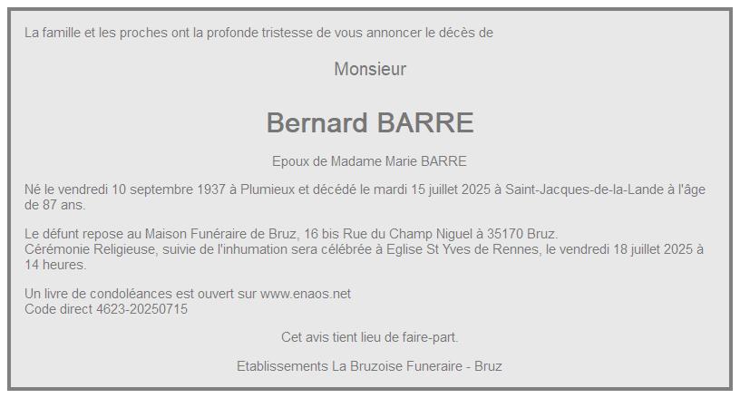 Cet espace « condoléances » est dédié à la mémoire de Monsieur Bernard BARRE.