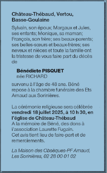 Cet espace « condoléances » est dédié à la mémoire de Madame Bénédicte PISQUET née RICHARD.