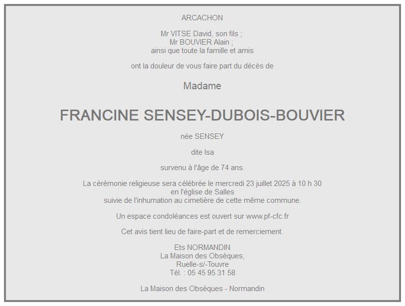 Cet espace « condoléances » est dédié à la mémoire de Madame FRANCINE SENSEY-DUBOIS-BOUVIER.