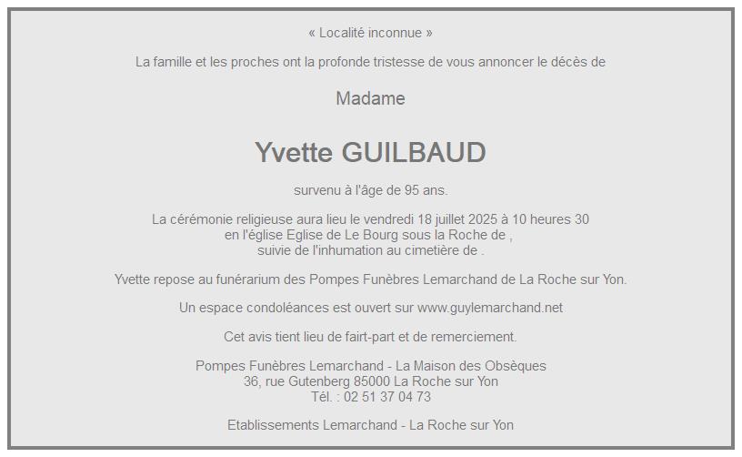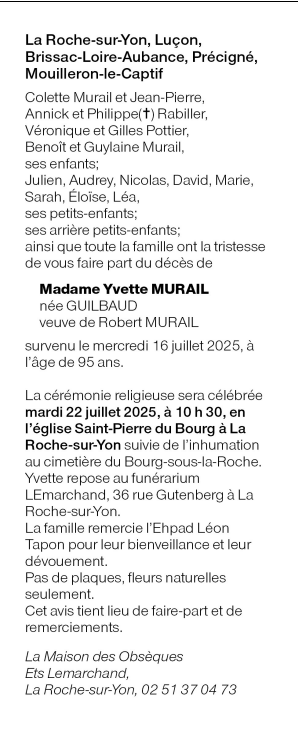 Cet espace « condoléances » est dédié à la mémoire de Madame Yvette MURAIL née GUILBAUD.