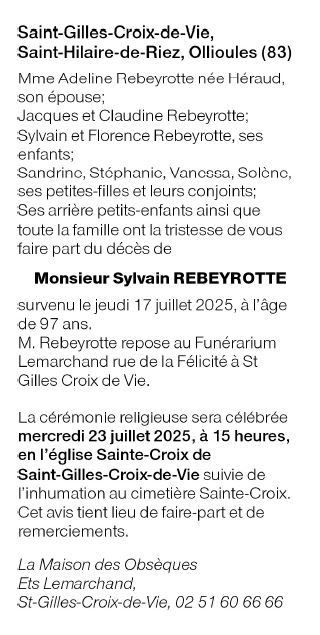 Décédé à Saint-Gilles-Croix-de-Vie (85800) le jeudi 17 juillet 2025